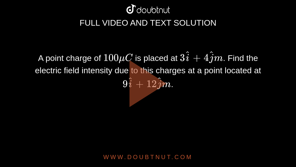 A Point Charge Of 100mu C Is Placed At 3 Hat J 4 Hat J M Find The Electric Field Intensity Due To This Charges At A Point Located At 9 Hat J 12